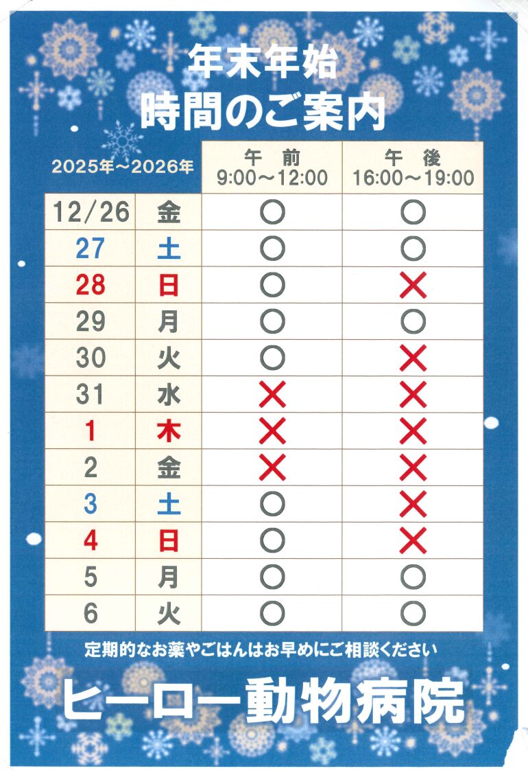 年末年始の診察時間について、以下の通りとさせていただきます。